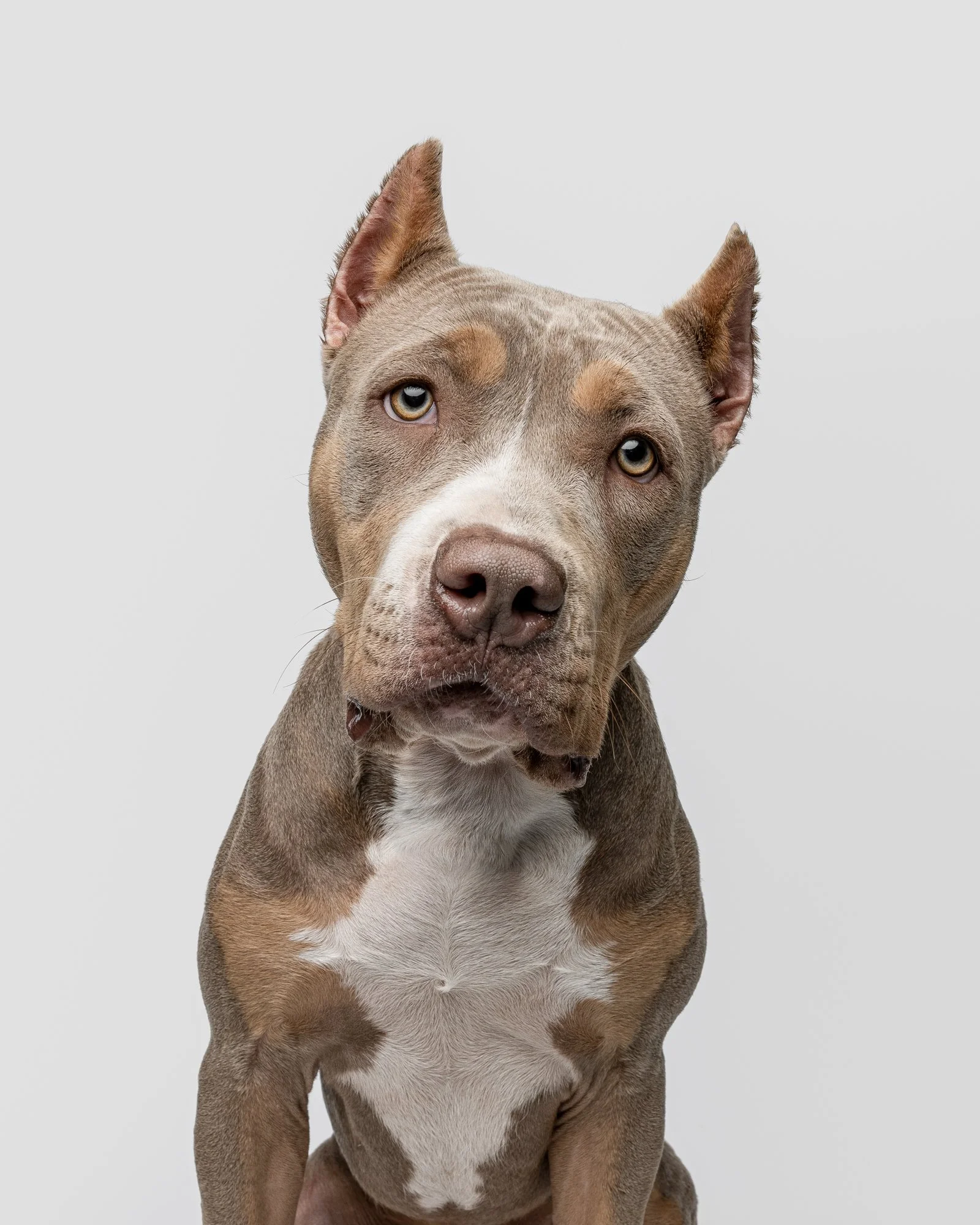 Greg Murray Photography | Cleveland Ohio based dog photographer pet photographer animal photographer | studio portrait of rescue pit bull sitting against a beige cream backdrop.jpg